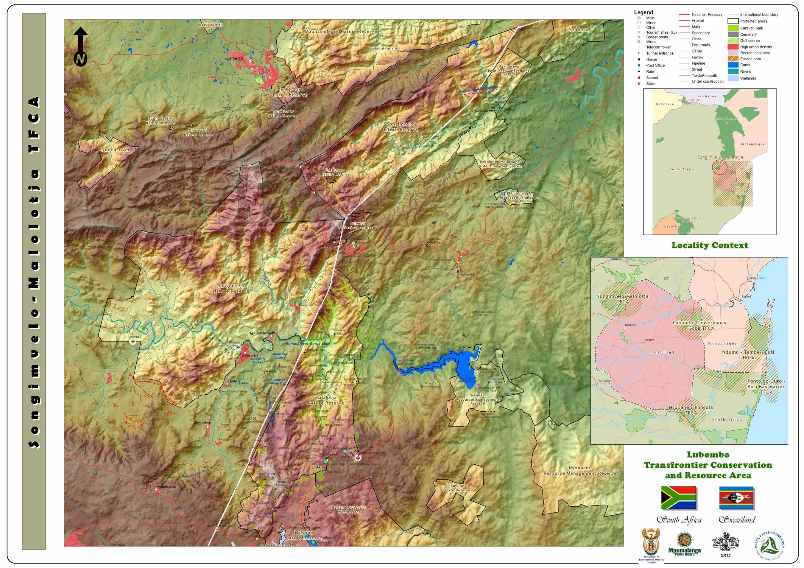 The departure point for this TFCA links the Songimvelo Nature Reserve in South Africa with the adjacent Malolotja Nature Reserve in Swaziland. The Drakensberg Escarpment (the dominant physiographic feature of south-eastern Africa), which together with its associated highlands and mountains are known locally as the Barberton Mountain Land, forms the central feature of the expanded TFCA with links to adjacent conservation areas. It is envisaged that the adjacent conservation areas such as Mountainlands Nature Reserve, Barberton Nature Reserve and Nkomazi Wilderness will form part of the second phase of the TFCA.